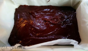 Schüttet nun die Milch-Zuckermischung zu der gehackten Schokolade in die Schüssel. Rührt die Masse so lange, bis die Schokolade vollständig geschmolzen ist. Füllt die Fudgemasse in die vorbereitete Form und streicht sie glatt.