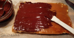 Nach der Kühlzeit schmelzt ihr euch die Kuvertüre und streicht sie gleichmäßig auf das Karamell.