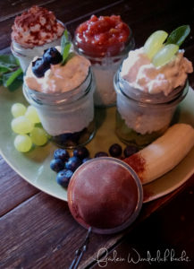 Früchte eurer Wahl (ich hatte Bananen, Blaubeeren, Weintrauben und ein leckeres Rhabarberkompott)
